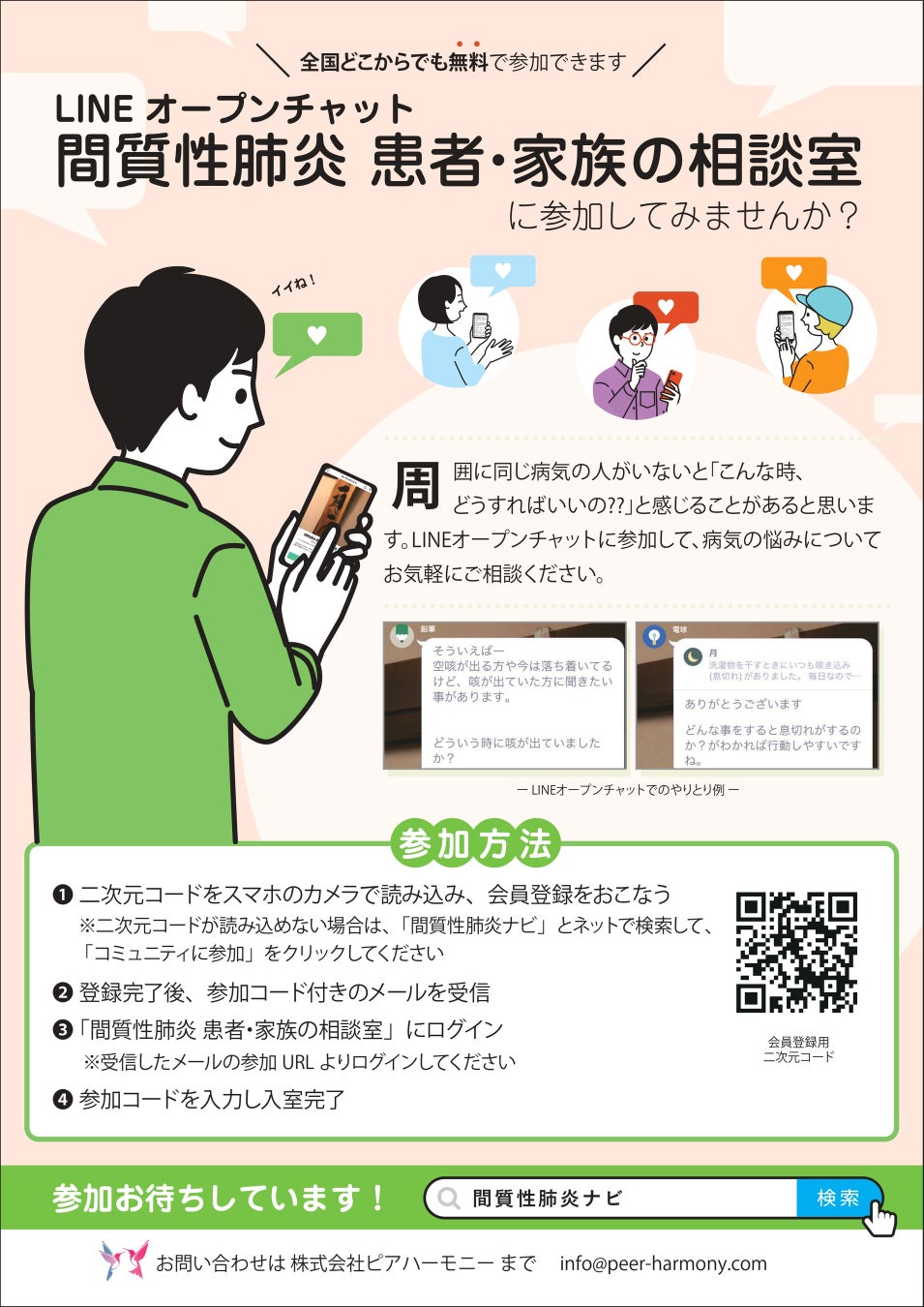 「間質性肺炎 患者・家族の相談室」は、間質性肺炎患者とそのご家族、支援者がご利用いただけるオンラインのコミュニケーションの場で、LINEを利用している方は匿名で無料参加が可能です。