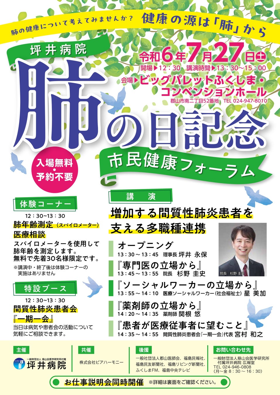 7月27日に開催される坪井病院主催の「坪井病院 肺の日記念 市民健康フォーラム」は、肺の健康について考える市民健康フォーラムになります。当日は、医師をはじめとする医療従事者の講演はもちろん、肺年齢測定、医療相談、特設ブースとして「一期一会」のブースを準備しております。また、演者として一期一会の宮村和之氏も登壇予定です。