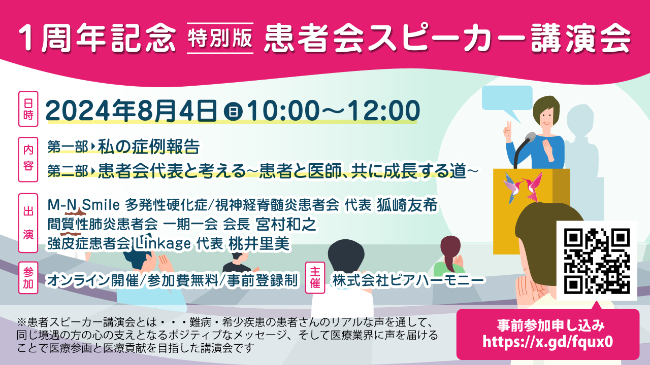 この度、株式会社ピアハーモニーが主催する患者スピーカー講演会に一期一会 会長 宮村が出演することとなりました。